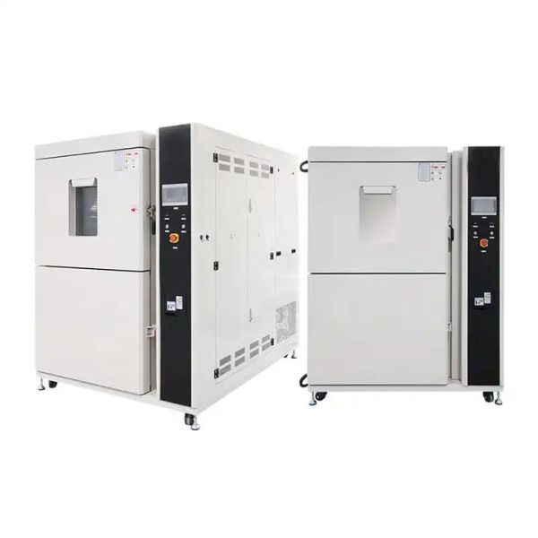Two Zone Thermal Shock Test Chamber is ideal for testing IC chips and small electronic products. The design consists of two independently controlled chambers. One room is hot, the other is cold. Products are quickly transferred between the hot and cold chambers, which will cause temperature shocks to the samples to help find product defects in electronic components and product assembly.Thermal stock chambers are used in all industries including Automotive, Electronics, Aerospace, and others to help find product defects in electronic components and product assemblies.